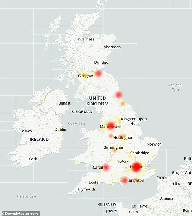 The tracking service, which aggregates reports from social media and its website, shows a widespread impact, with users in major cities like Manchester, Liverpool, and Cardiff reporting issues.