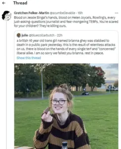 Her tweet, which read, ‘If they all had one throat, man,’ came in the wake of the murder of Brianna Ghey, a British transgender teenager.