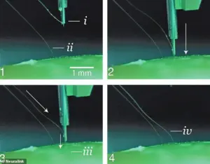The implantation process involves a ‘sewing-machine-like’ robotic surgeon inserting threads into specific brain areas via a minuscule skull incision.