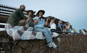Multiple theories have floated around that the lights are from car headlights, a chemical reaction in the air, or alien activity (Pictured: People gathered to watch the lights).