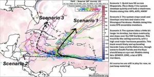 Forecasting models suggest three main scenarios: the storm could rapidly strengthen and hit Hispaniola, develop slowly to strike Nicaragua or Honduras, or, in an extreme scenario, move close to South Florida, including the Keys.