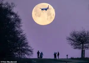 Meanwhile, in Richmond Park, a plane bound for Heathrow was spotted with the Wolf Moon glowing behind it, a surreal juxtaposition of modernity and ancient cosmic rhythms.