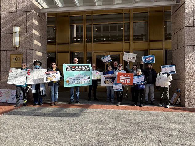 Outside the National Capital Planning Commission (NCPC) meeting, a small but vocal group of protesters gathered, their signs and chants aimed at the ongoing White House ballroom project.