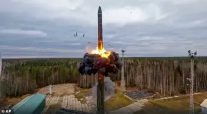 Pictured is a Russian Yars intercontinental ballistic missile during a test fire in 2022.