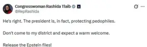 Democrat Congressman Pat Ryan of New York called Sabula ‘a f**king American hero,’ while Congresswoman Rashida Tlaib, who represents Michigan’s 13th District, accused Trump of ‘protecting pedophiles’ and demanded the release of the ‘Epstein files.’ Their endorsements have amplified the political dimension of the incident, framing it as a clash between Trump’s rhetoric and his perceived actions.