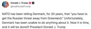 Now it is time, and it will be done!!!’ he warned on Truth Social, signaling his determination to pursue Greenland’s sovereignty despite international opposition.