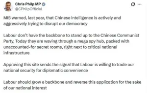 MPs from across the political spectrum, including some within Labour, have urged Communities Secretary Steve Reed to block the application. ‘This is the wrong decision for the UK, sending all the wrong signals,’ de Pulford said, emphasizing the risks to both national security and the safety of those opposing the Chinese state.