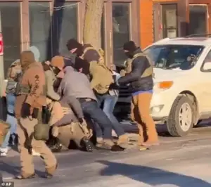 Immigration and Customs Enforcement (ICE) agents during a struggle near 26th Street and Nicollet Avenue in south Minneapolis on Saturday morning.