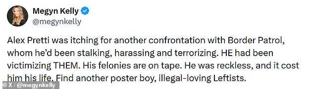 Megyn Kelly, a prominent television personality and former Fox News anchor, took to social media to comment on the footage, criticizing Pretti for ‘stalking, harassing and terrorizing’ Border Patrol agents.