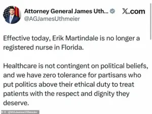 On Thursday, Florida Attorney General James Uthmeier announced that Martindale ‘is no longer a registered nurse in Florida.’ The statement emphasized that ‘healthcare is not contingent on political beliefs’ and that the state has ‘zero tolerance for partisans who put politics above their ethical duty to treat patients with the respect and dignity they deserve.’ According to the Florida Department of Health’s portal for registered nurses, Martindale voluntarily relinquished his license, a process described on the department’s website as ‘not constituting discipline.’ However, an unidentified high-ranking state official confirmed to Fox News that Martindale’s license was relinquished after he moved out of state to Indiana without notifying the Florida Board of Nursing, thereby violating a compact agreement among states that governs the practice of nursing across state lines.